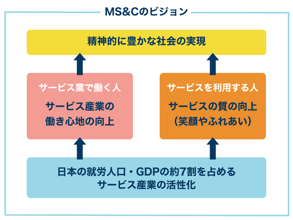 サービス業で働く多くの人が、仕事のやりがいや楽しさを感じ、充実した毎日を送ることができる環境をつくる。それにより、サービス業を利用する人が、「美味しい」「楽しい」「嬉しい」を感じ、幸せな時間を過ごすことができるようになる。精神的に満たされる社会・笑顔あふれる世の中を実現を目指しています。